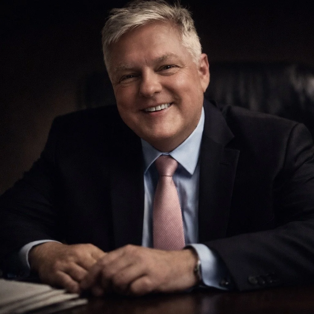 • Man in formal suit smiling in a conference room with American flags in the background.